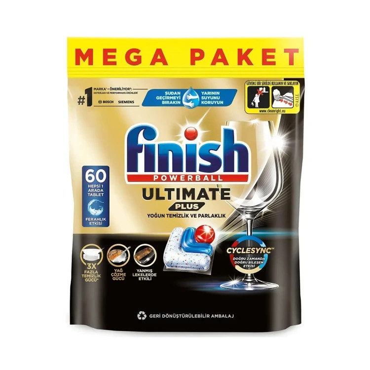 قرص ماشین ظرفشویی Finish Powerball Ultimate Plus محصولی از سری ویژه Mega Paket با قدرت شویندگی سهبرابر (3X Temizlik Gücü) و فرمول پیشرفته برای ظروف کاملاً تمیز و براق طراحی شده است. این قرص با فناوری هوشمند CycleSync™ در زمان دقیق چرخه شستشو فعال میشود تا بیشترین تأثیر را در حذف لکهها و چربیها داشته باشد.