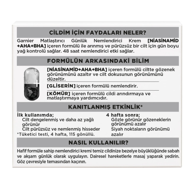 کرم مرطوبکننده Garnier Saf & Temiz AHA+BHA Charcoal Moisturiser یک آبرسان روزانه و ماتکننده تخصصی است که برای پوستهای چرب، براق و مستعد جوش طراحی شده است. فرمول این کرم شامل ترکیب مؤثر زغال فعال (Activated Charcoal) برای جذب چربی اضافی، اسیدهای آلفا و بتا هیدروکسی (AHA, BHA) برای لایهبرداری ملایم و عناصر مرطوبکننده فعال است که بافت پوست را نرم و یکدست میکند.