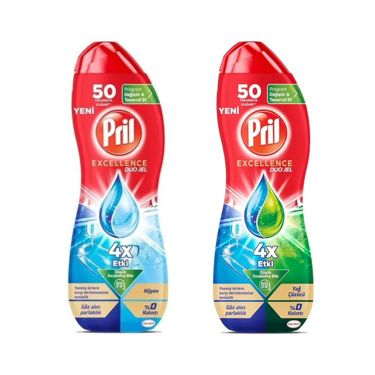 ژل ماشین ظرفشویی Pril Excellence Duo یکی از جدیدترین نسلهای شوینده برند معتبر «پریل» است که با فرمول دومرحلهای خود (Duo Formula) ترکیبی از قدرت چربیزدایی و درخشندگی بینقص ظروف را ارائه میدهد. این محصول با تأثیر ۴ برابر قویتر نسبت به شویندههای معمولی حتی در دمای پایین نیز عملکرد کاملی دارد. طراحی دو فاز آبی و سبز آن، با فعالسازی جداگانه در هر مرحله، تضمین میکند که لکههای سخت، چربیهای خشک و باقیماندههای غذا کاملاً برطرف شوند.